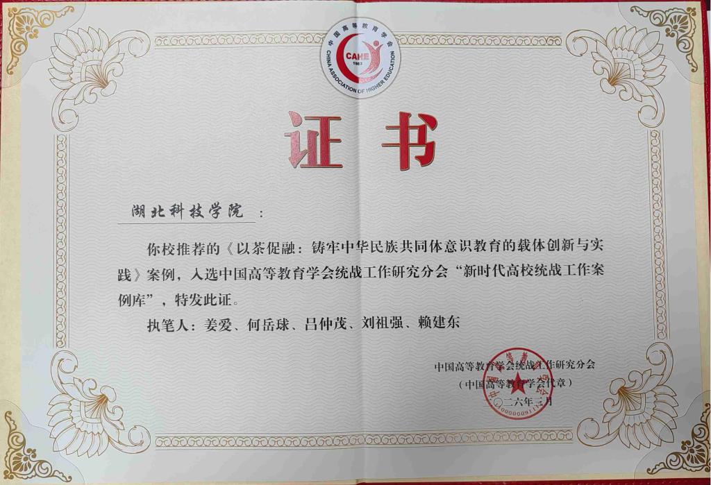 近日,中国高等教育学会统战工作研究分会公布“新时代高校统战工作案例库”入选名单,湖北科技学院报送的《以茶促融:铸牢中华民族共同体意识教育的载体创新与实践》案例成功入选,为学校统战工作高质量发展再添新成果。本次案例征集面向全国高校,经严格评审,全国仅60项案例成功入库。