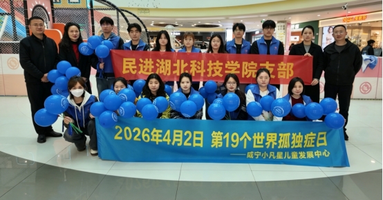 2026 年 4 月 2 日,在世界孤独症关注日当天,中国民主促进会湖北科技学院支部联合湖北科技学院药学院团委学生会,携手民进咸宁青委会、民进香城支部、咸宁小凡星儿童康复中心、咸宁睿视康眼科,在咸宁万达广场、开展 “点亮蓝丝带・守护小星星” 公益服务活动,以实际行动关爱孤独症儿童,传递社会温暖。