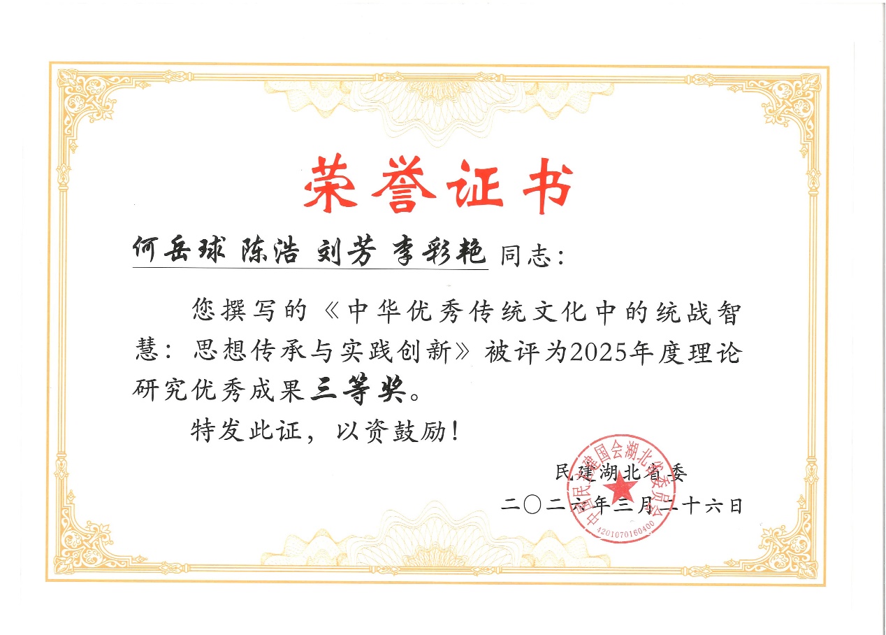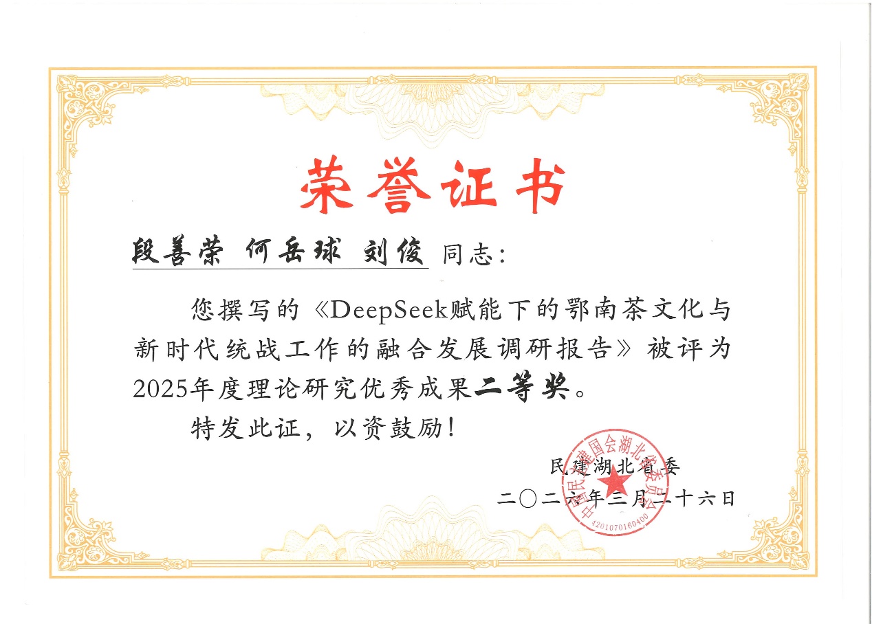 在理论研究方面,段善荣、何岳球、刘俊同志撰写的《DeepSeek赋能下的鄂南茶文化与新时代统战工作的融合发展调研报告》,荣获2025年度理论研究优秀成果二等奖。何岳球、陈浩、刘芳、李彩艳同志共同撰写的《中华优秀传统文化中的统战智慧:思想传承与实践创新》,荣获2025年度理论研究优秀成果三等奖。